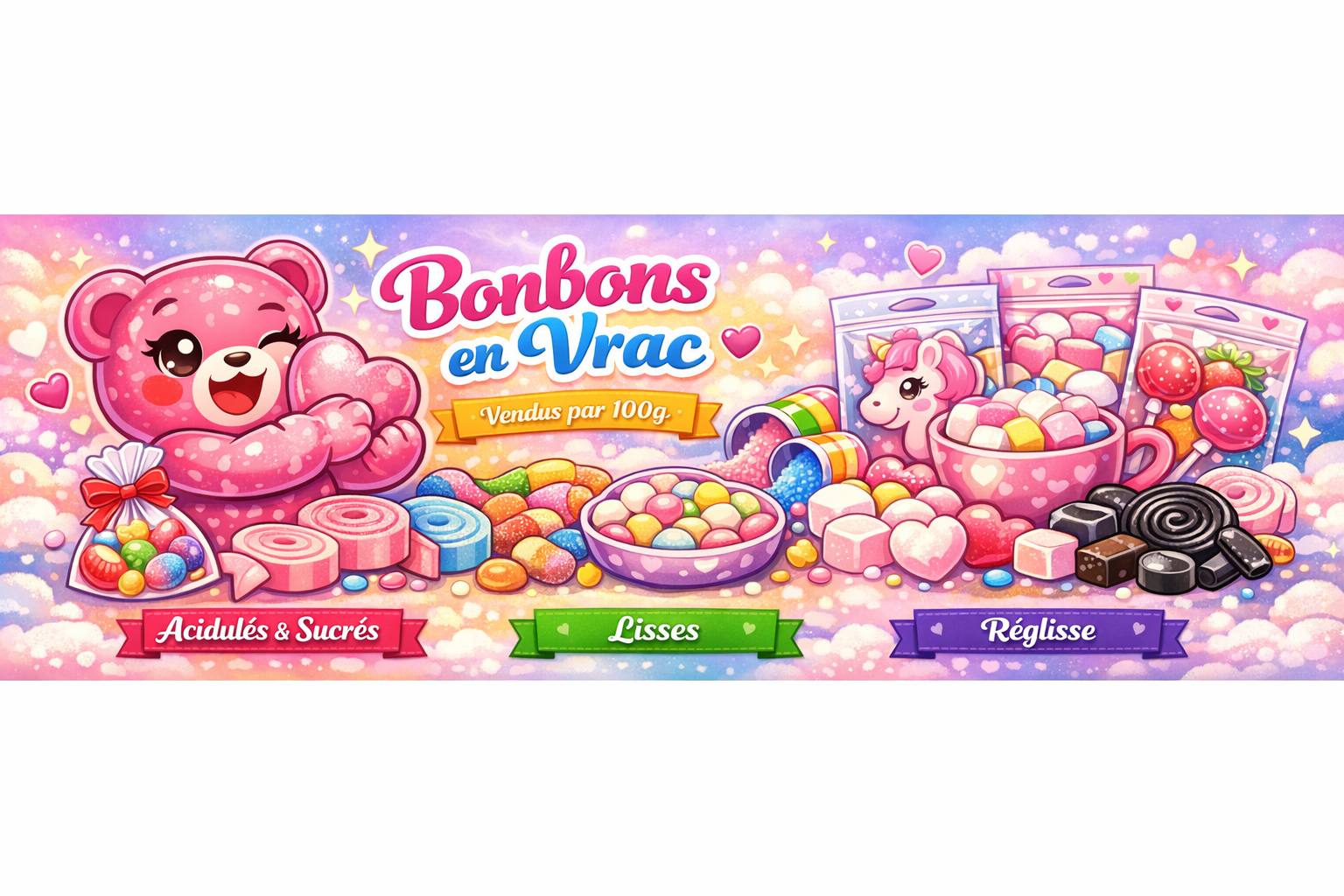 Bienvenue dans notre univers de bonbons vendus en vrac, au poids, par 100g.