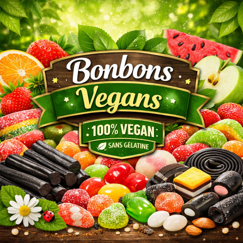 Découvrez notre sélection de bonbons vegan, spécialement conçus pour celles et ceux qui souhaitent se faire plaisir sans ingrédients d’origine animale. Gélifiés, fruités, acidulés ou rétro… nos bonbons vegan offrent une gourmandise authentique, tout en respectant vos valeurs.