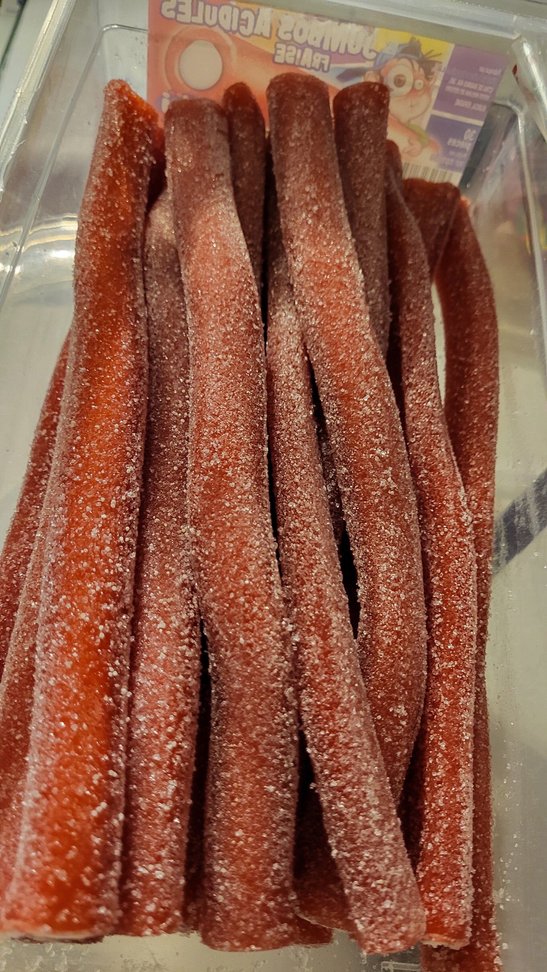 INGREDIENTS : Sucre, Sirop de glucose-fructose, FARINE DE BLÉ, Eau, Acidulant : E330, E296, Graisse végétale (Noix de coco), Régulateur d’acidité : E350, Émulsifiant : E471, Arômes, Agent de conservation : E202, Colorants E102*, E129*, E133, E341, E516.