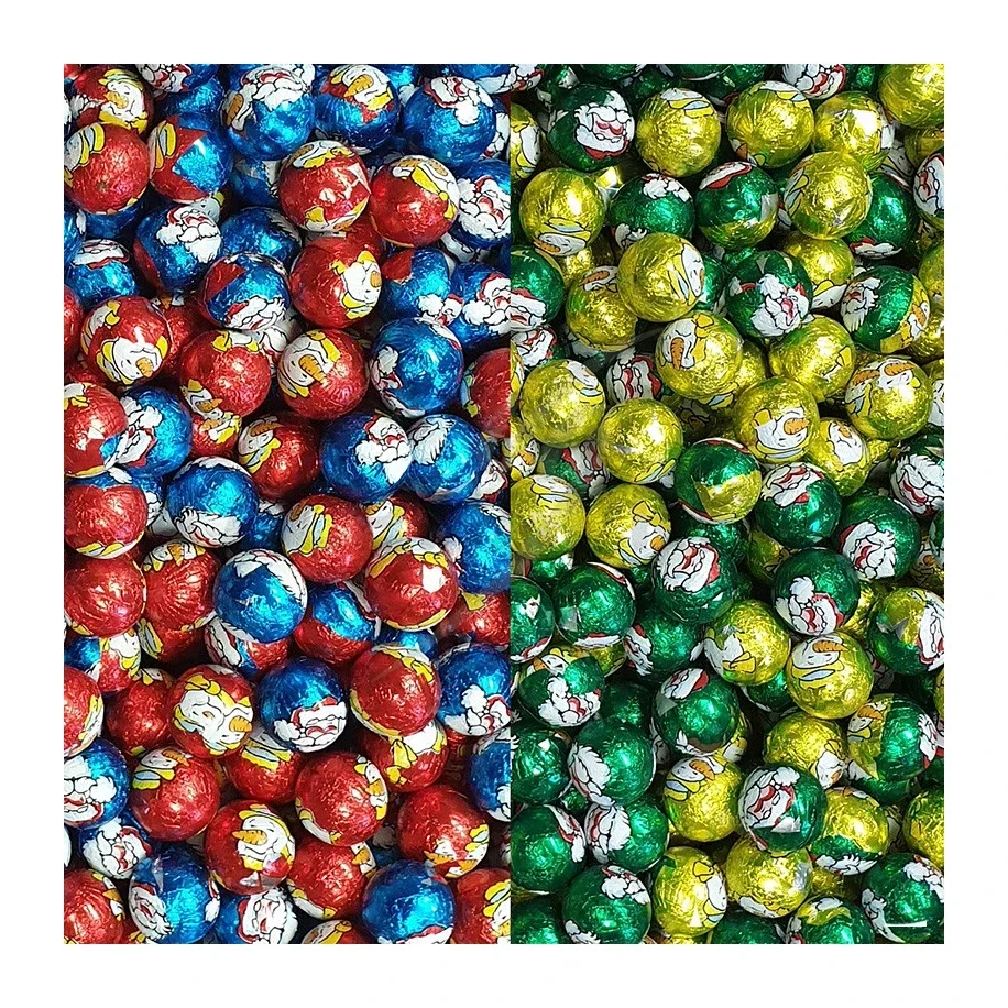 Petites boules au goût chocolat au lait fourrés crème de lait emballées individuellement sous papier alu coloré (assortiments Or-vert ou bleu-rouge selon stock disponible).