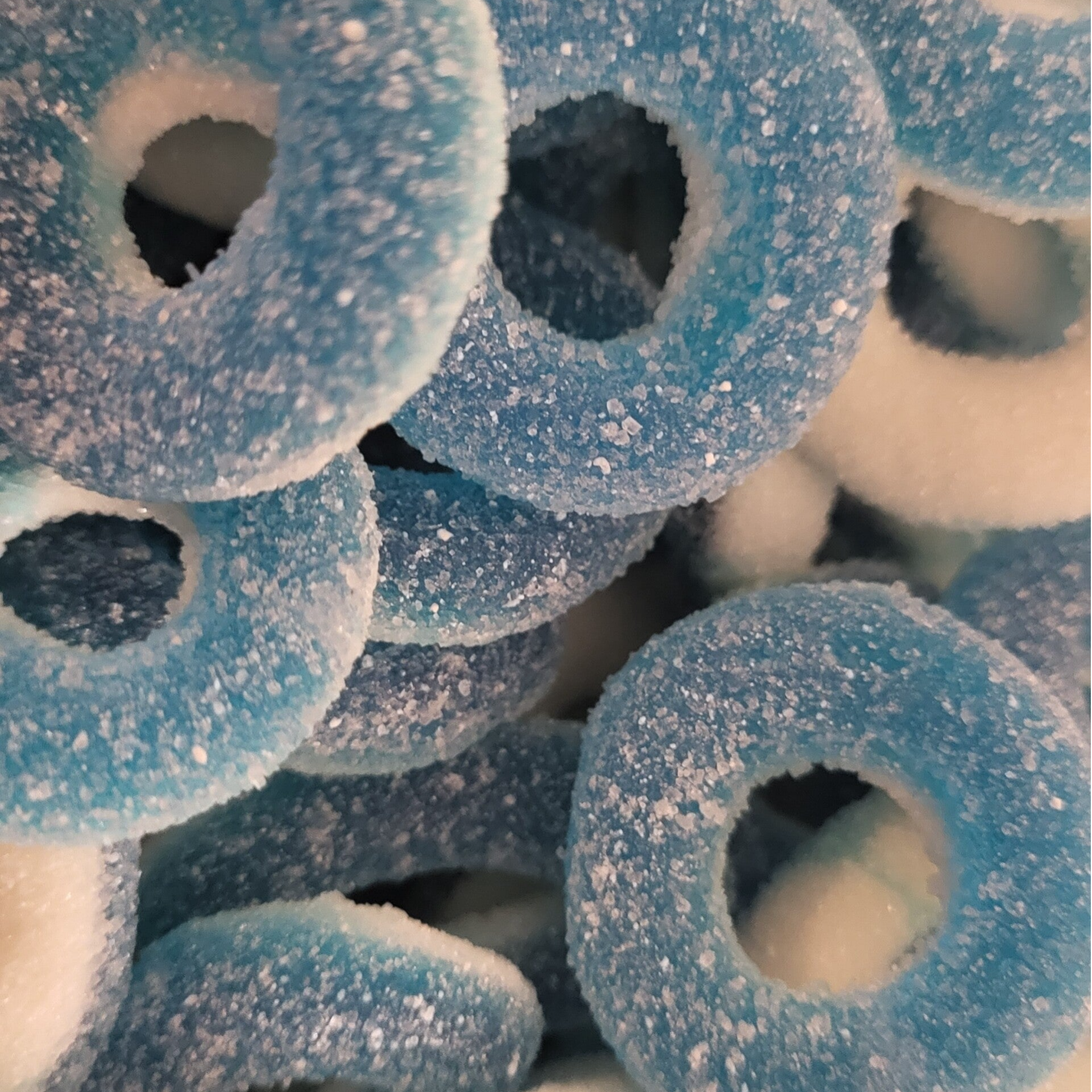 Ingrédients : Sirop de glucose, sucre, eau, gélatine de bœuf, amidon modifié de pomme de terre, acidifiants : E330, E270, agent d'enrobage : huile végétale (palme), E901, E903, arômes, colorants : E129, E100, E133.