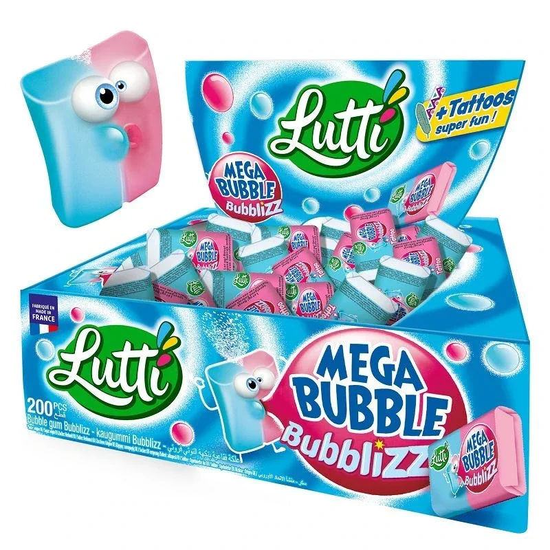 le MEGA BUBBLE BUBBLIZ de Lutti, le chewing-gum qui transformera vos pauses sucrées ! Grâce à sa recette ultra tendre, il rend la mastication plus agréable et vous permet de réaliser d'énormes bulles tout en vous amusant avec des tatouages ludiques. Proposés en emballages individuels, ces chewing-gums sans gélatine sont idéaux pour partager ou pour un moment de pur plaisir. Plongez dans un univers de saveurs bleu et rose et laissez-vous séduire par la magie des bulles !